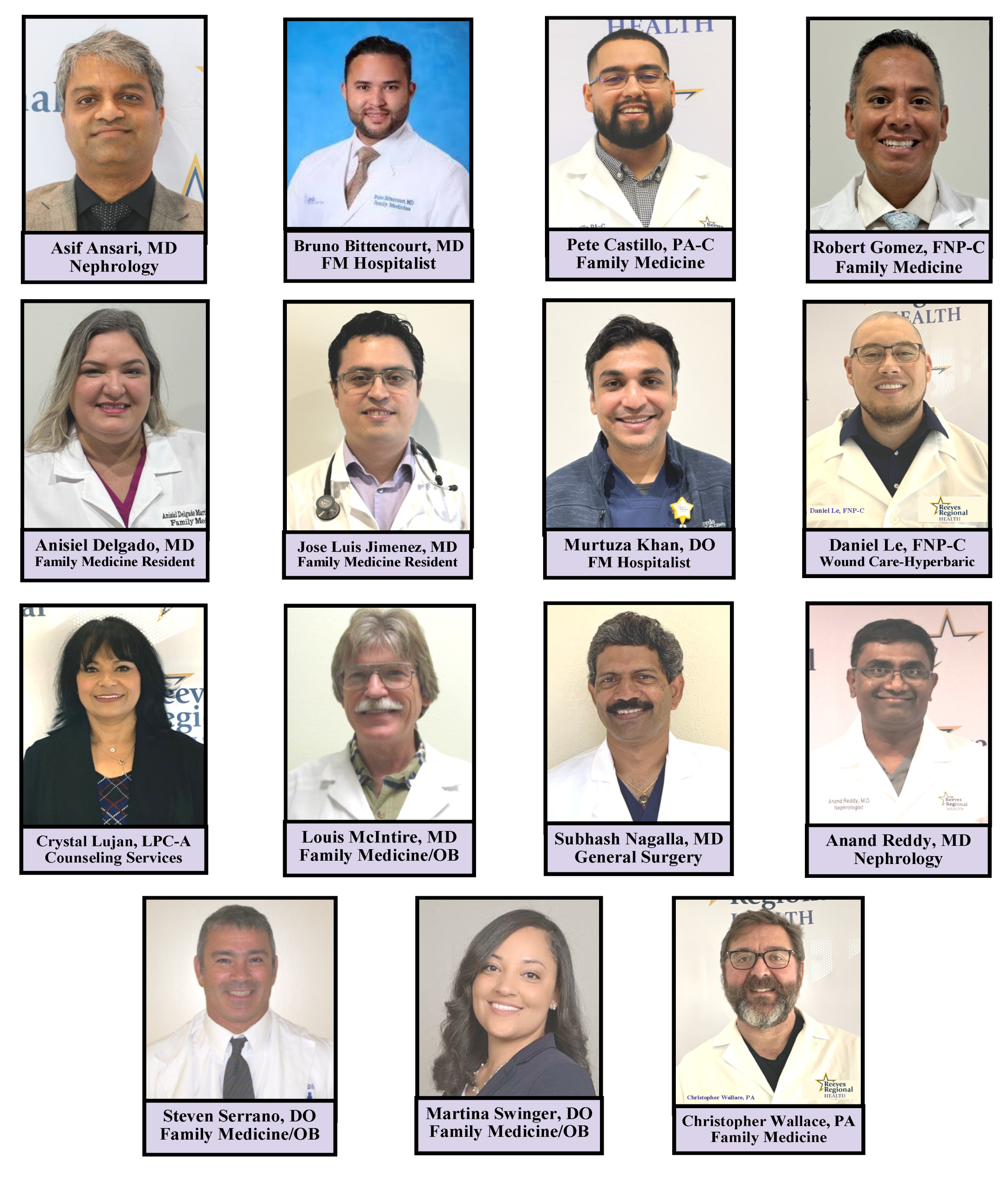 At Reeves Regional Health, we have a medical team with various specialties that can help diagnose and treat many common illnesses. For more information about a provider or to schedule an appointment, please call their office. Medical staff listed are located in the Reeves Regional Rural Health Clinic 432-447-0565/0566.